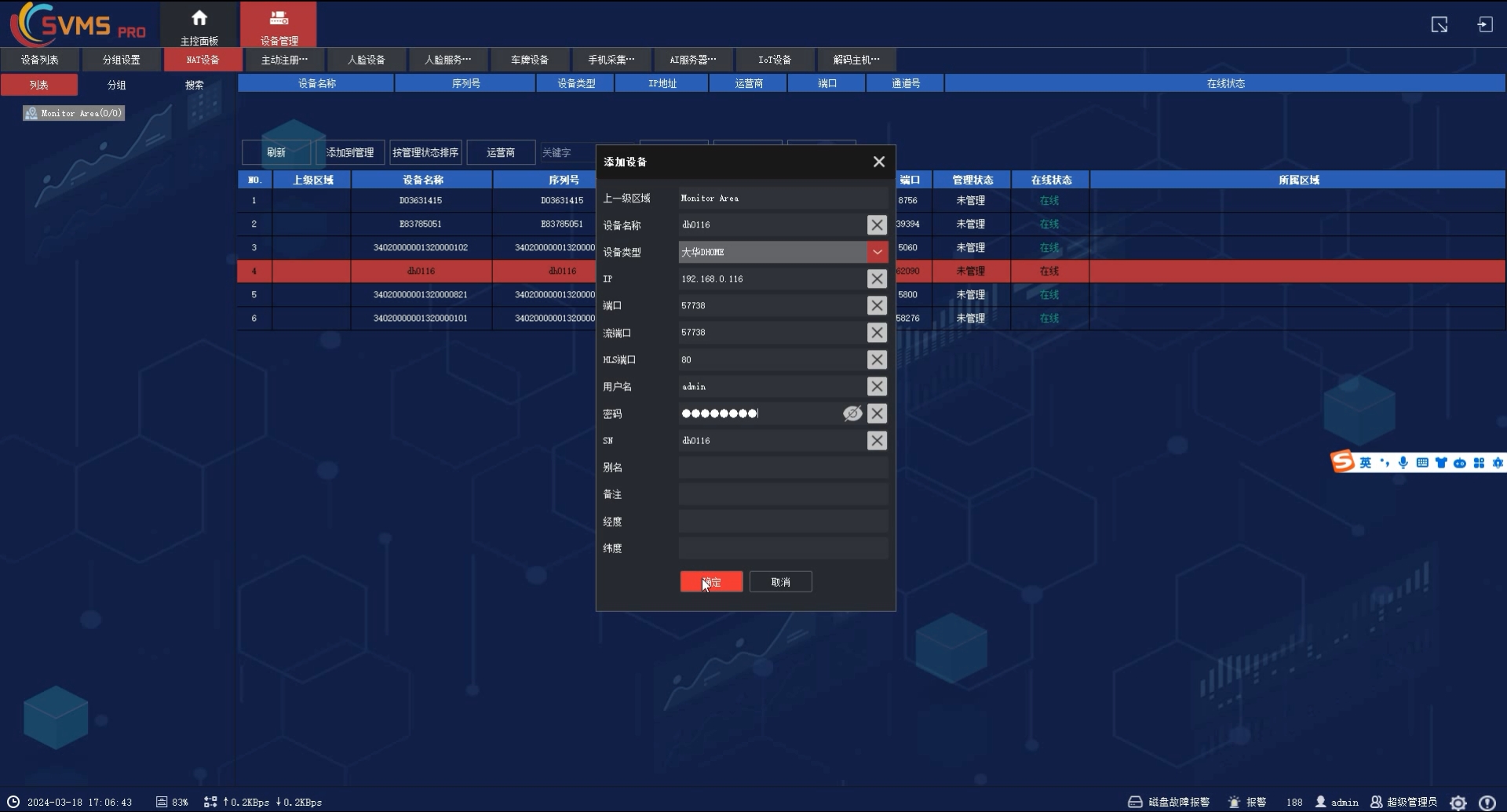 步骤二:登录SVMSPro客户端,进设备管理-NAT设备,设备注册过了后会有对应的ID在下面列出来,左边组织树创建相应的区域,选中设备点添加到管理即可,