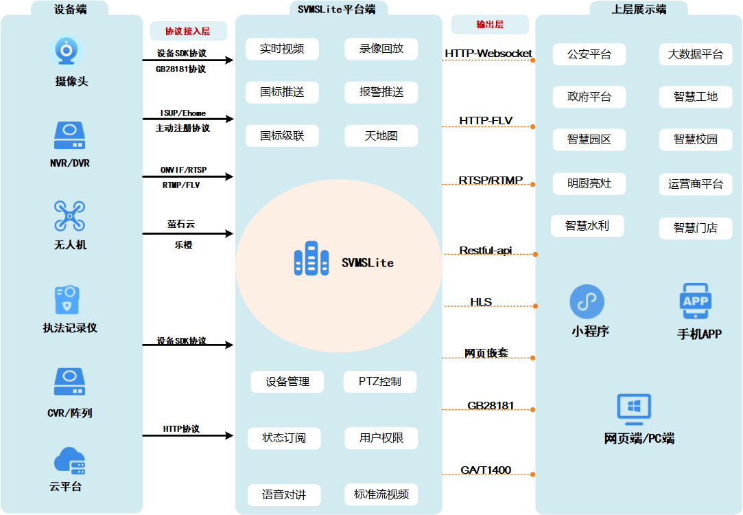 SVMSLite 视频汇聚平台SVMSLite视频资源汇聚平台是我司自主研发的视频中台,深度整合音视频处理、存储调度与流媒体分发能力,专为高并发、多协议、多网络环境下的安防视频统一管理设计。